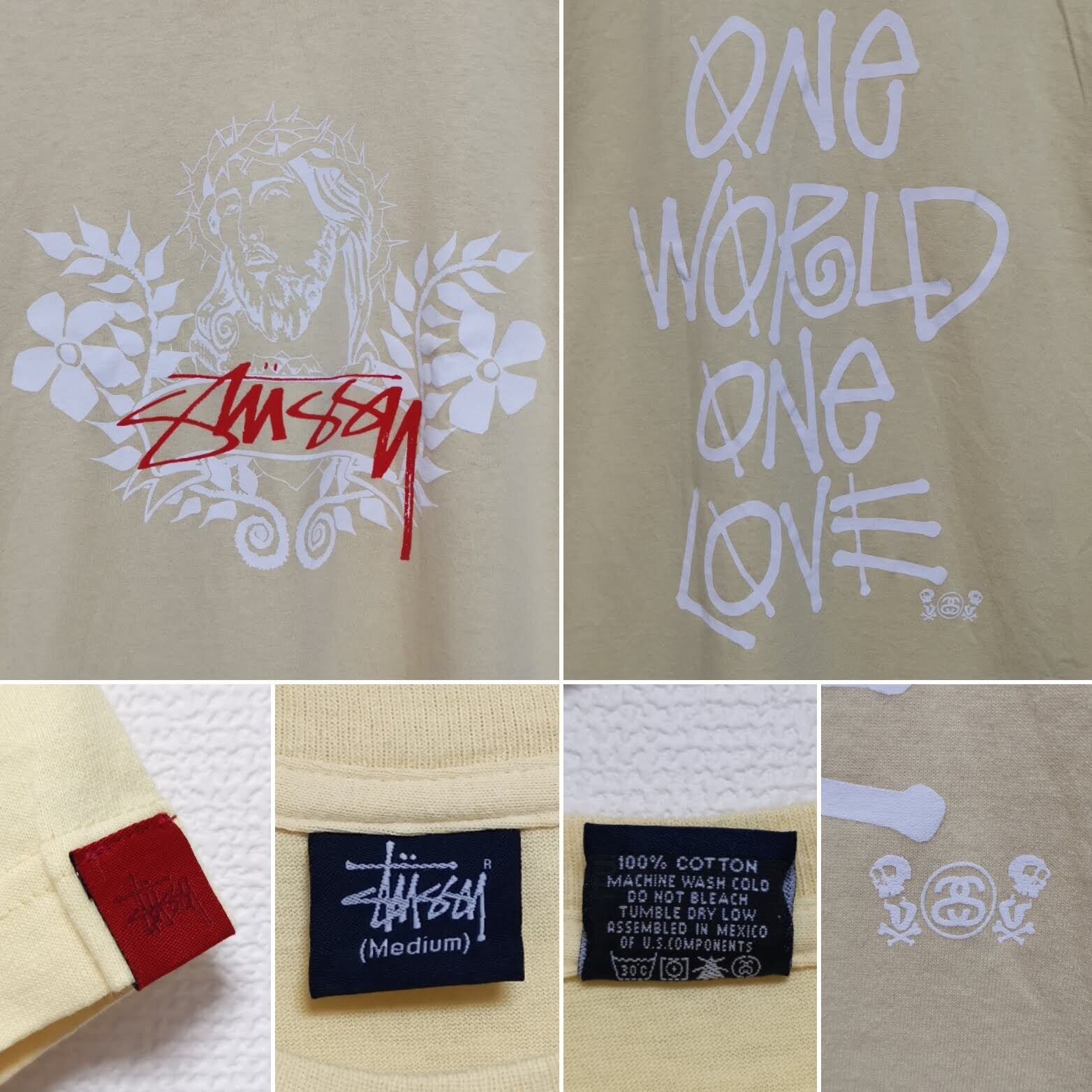 【コメント】:2000年代のSTUSSY×TENDERLOIN Tシャツです。MEXICO製、希少なイエローボディ!前面はジーザス&ストックロゴ、後面はONE WORLD ONE LOVEにK7スカルのシャネルロゴが入ります!こちらは未使用ですが昔のモノですので一応古着扱いでお願いします。