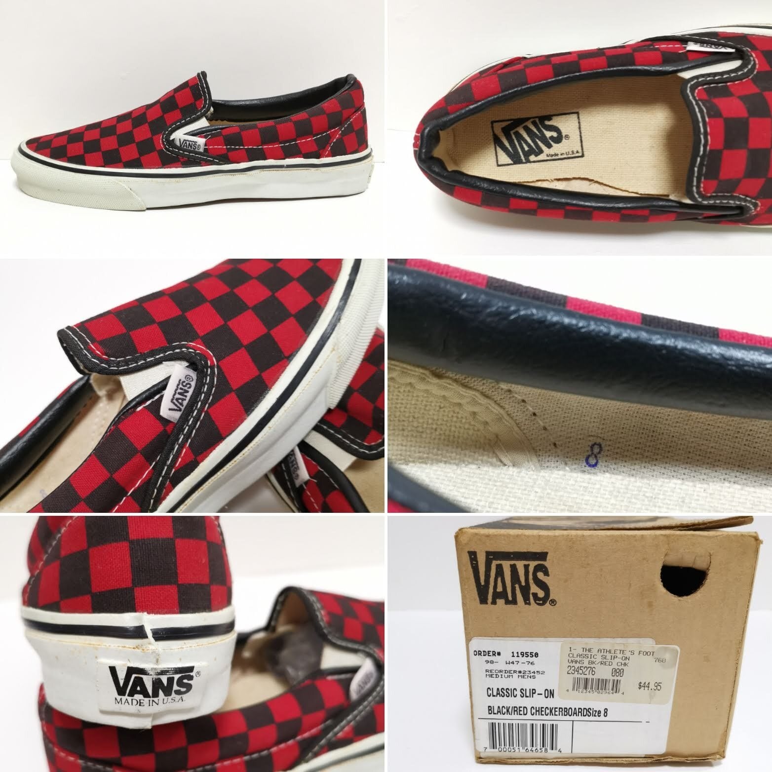 【コメント】:90年代のVANSチェッカーボードSLIP-ONです。USA製、箱付き、希少な黒赤ボディの新品デッドストックになります。未使用ですが保管時による若干の黄ばみ有りのお品です。昔のモノですので一応古着扱いでお願いします。